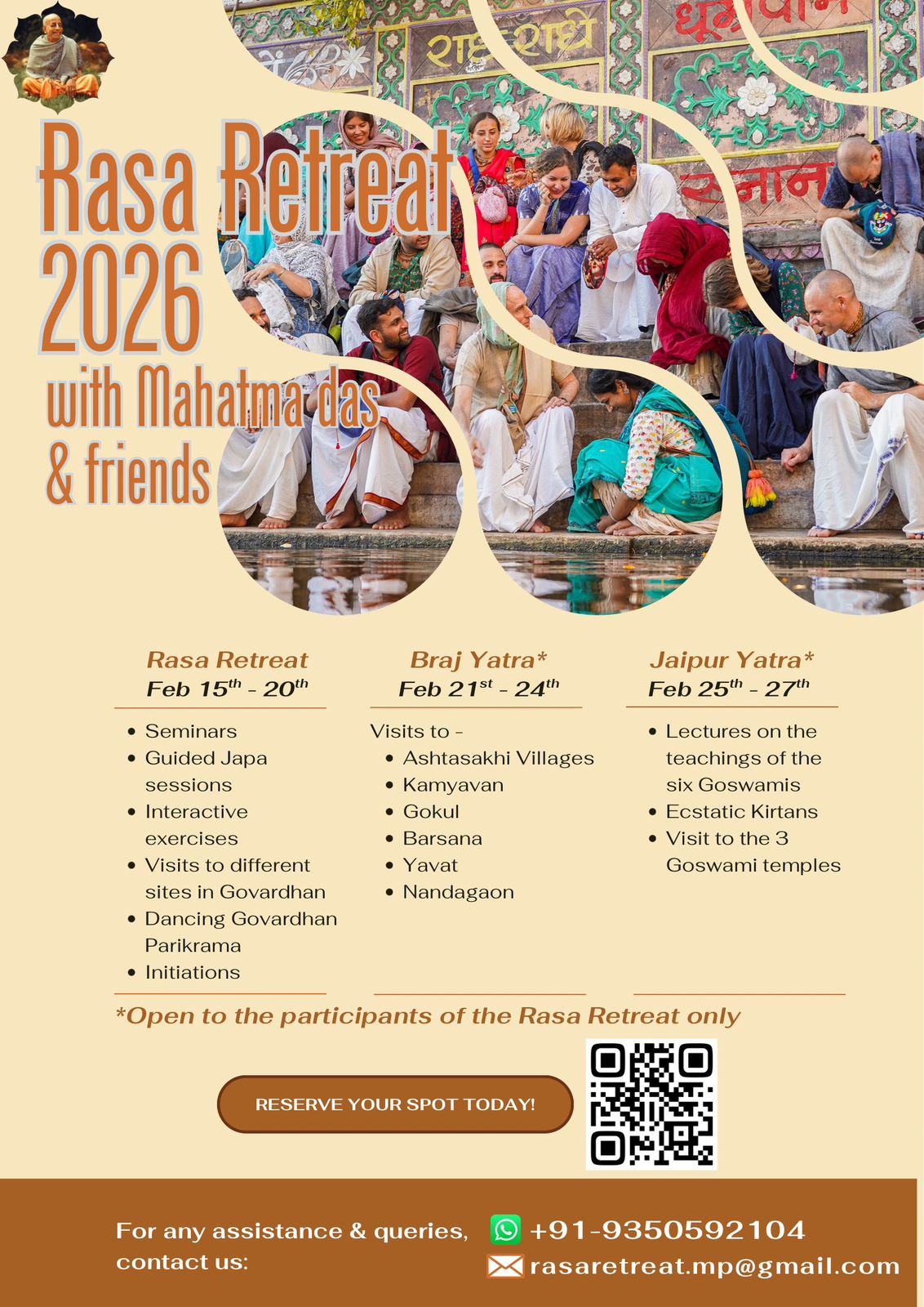 We are thrilled to invite you to the annual Rasa Retreat with HG Mahatma prabhu! Join us for an immersive *5-day retreat* and we will also have two blissful pilgrimages: Braj Yatra and Jaipur Yatra, exploring how we can deepen our connection to the sacred mood of Braj.